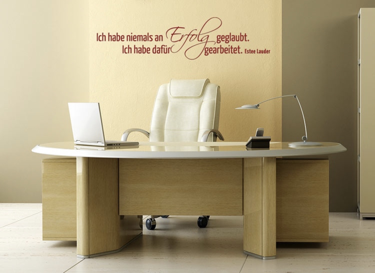Bürotattoos: Ein Blickfang für wartende Kunden oder gegen langweilige Wände, eine lustige Botschaft für die Kollegen oder etwas zum Nachdenken sowie Ernsthaftes, als Mitarbeitermotivation oder Nervenstärkung, ein Aufruf zum „Dranbleiben“ auch wenn es ungewöhnliche Ideen und Strategien sind, das sind unsere Wandtattoos fürs Büro! … und ganz nebenbei werten Sie jedes Büro und jeden Arbeitsplatz optisch auf! Wir machen auch Ihr Firmenlogo oder Ihren Slogan als Wandtattoo, benutzen Sie dazu unsere Anfrageseite!