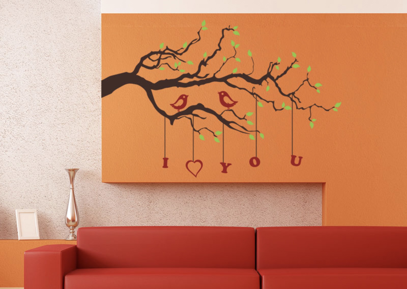 Wandtattoo I love you Schöner Zweig in braun, mit lindgrünen Blättern, Farbe der Vögel und I love you wählbar