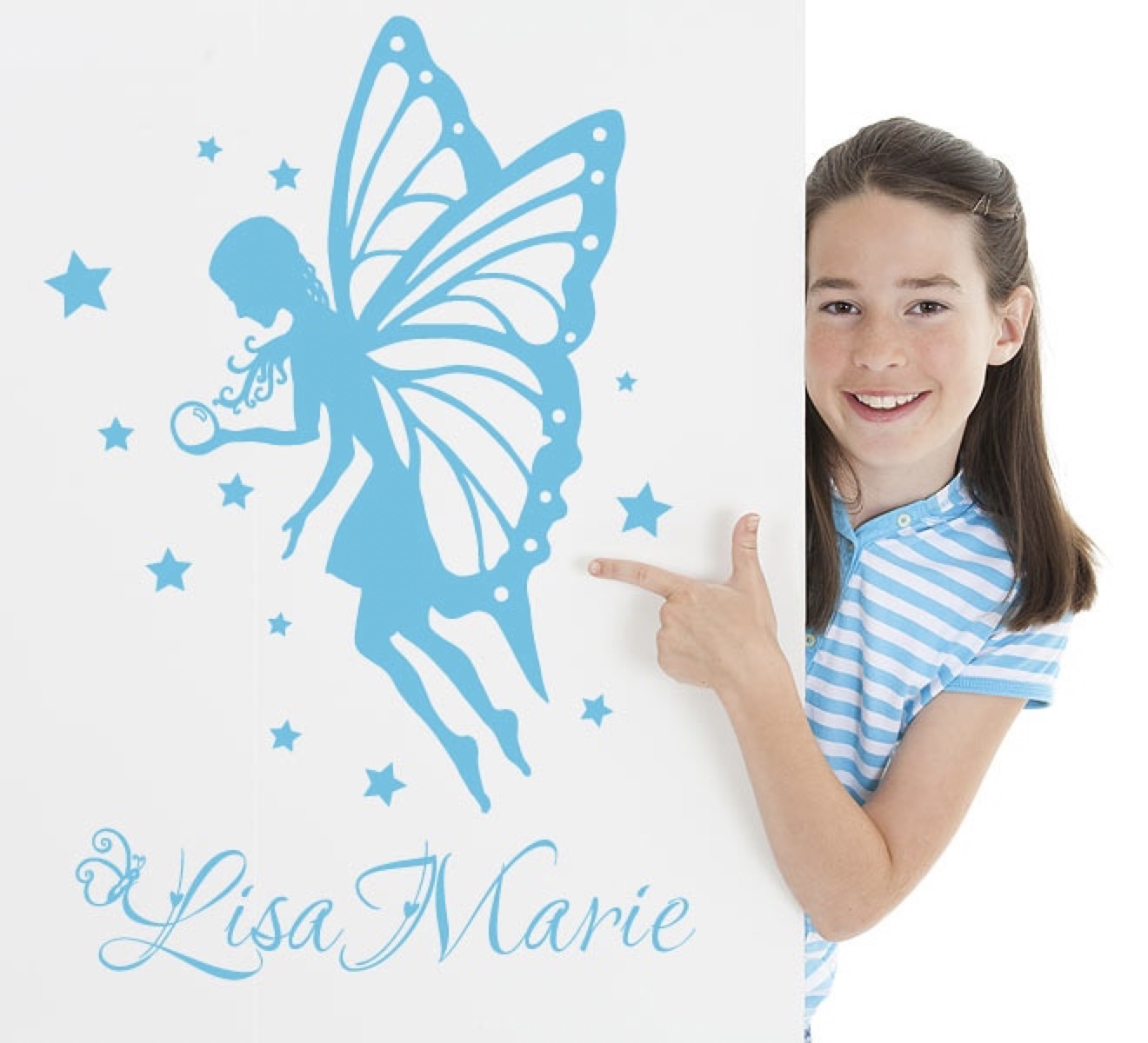 Wandtattoo Tinkerbell mit individuellem Namen. Das Set besteht aus Tinkerbell, 20 Sternen verschiedener Größe zum selber platzieren und einem indizviduellen Namen in 80cm Länge.