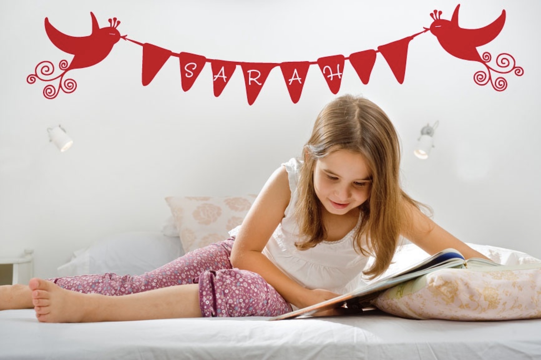 Wandtattoo Vögel mit Wimpelband Individueller Name mit max. 8 Buchstaben.