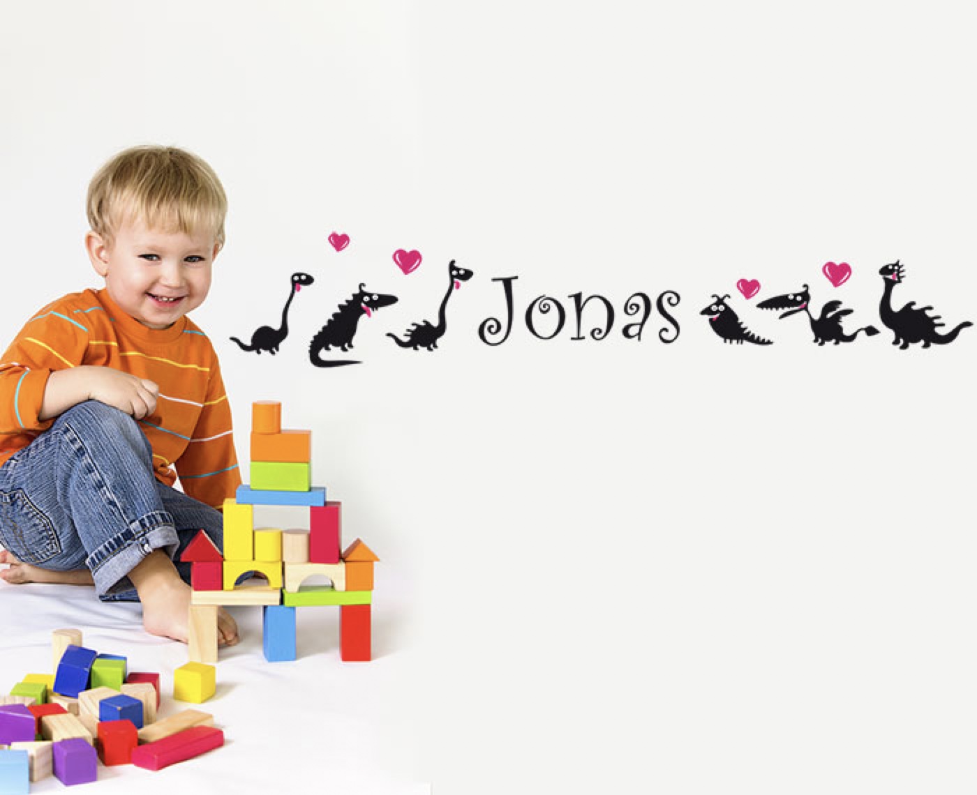 Wandtattoo Drachen Ein schöner Drachen mit individuellem Namen in gebogener Schrift.